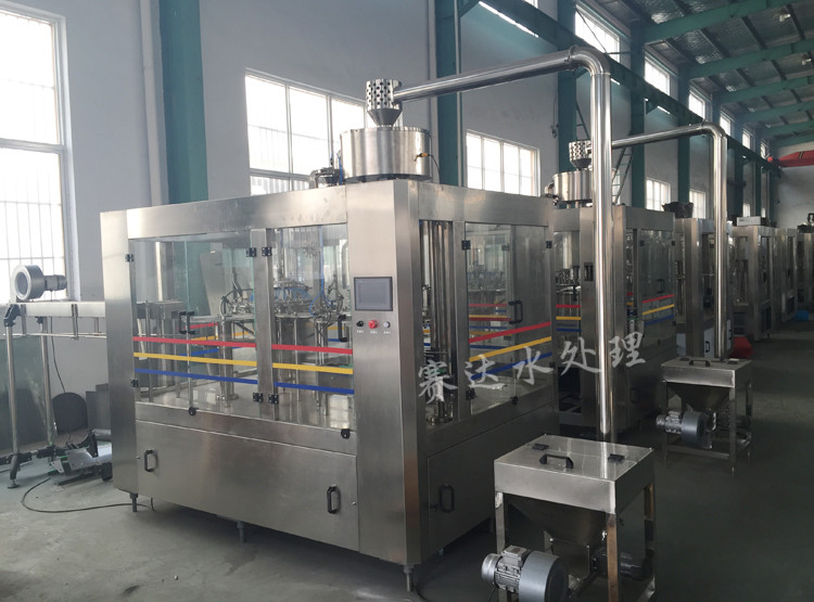 本公司生產(chǎn)的CGF18/18/6型沖洗、灌裝、封蓋機(jī),是在引進(jìn)、消化吸收國(guó)內(nèi)外同類(lèi)產(chǎn)品的基礎(chǔ)上,結(jié)合了本公司多年生產(chǎn)經(jīng)驗(yàn)后開(kāi)發(fā)的新產(chǎn)品。該機(jī)組集灌裝、封口于一體,由一個(gè)傳動(dòng)電機(jī)傳動(dòng)。具有自動(dòng)化程度高、結(jié)構(gòu)緊湊、外形美觀、操作維護(hù)方便、安全可靠、生產(chǎn)能力連續(xù)可調(diào)等優(yōu)點(diǎn),是目前國(guó)內(nèi)較為理想的礦泉水、純凈水、飲料灌裝生產(chǎn)設(shè)備。